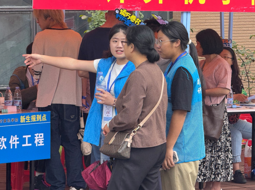 在教学楼前的计算机学院报到处,蓝色的帐篷格外醒目。身穿蓝色马甲的师长与学长学姐们分工明确、有条不紊,脸上始终挂着亲切的笑容。他们一边熟练地为新生办理水卡激活、军训物资领取、宿舍分配等手续,一边耐心倾听新生的困惑,从课程安排到校园生活,细致入微的解答让新生们逐渐放下紧张,对大学生活充满期待。