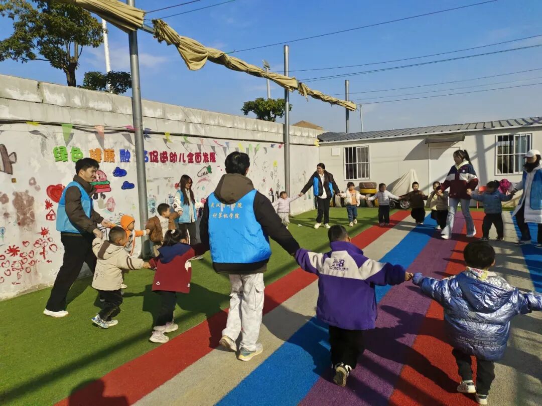 根据大、中、小不同班级的特点,志愿者们量身打造了丰富多彩的互动环节。大班的 “拍拍敲敲” 跟着音乐节奏尽情律动,“123 木头人” 让孩子们在奔跑与静止间收获满满快乐,志愿者们全程守护,确保每个孩子都能安全参与;中班的 “大风吹” 考验反应力,“吹泡泡” 时孩子们手拉手围成圈圈,笑声随泡泡一起飞扬,“击鼓传花” 更是选出了勇敢的小志愿者,现场氛围热烈又温馨。