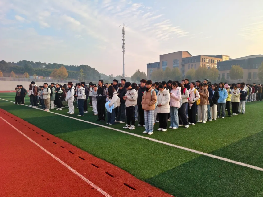 2025年11月24日,计算机学院全体师生齐聚在田径场上,举行庄严而神圣的升旗仪式。本次出席升旗仪式的领导老师有计算机学院党总支书记王天见老师、团总支书记余延旺老师、辅导员杜泽老师、杨悦老师,以及全体24级与25级同学。