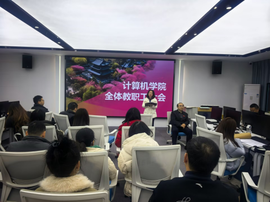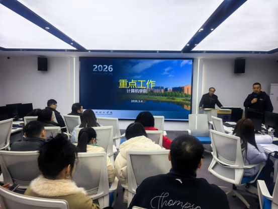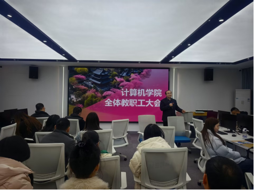 为全面谋划2026年学院各项工作,明确发展目标与重点任务,凝聚全体教职工奋进力量,2026年3月4日下午,计算机学院在实2-308召开2026年新学期全体教职工大会。院长黄传河主持会议并作动员讲话,学院全体教职工参会。