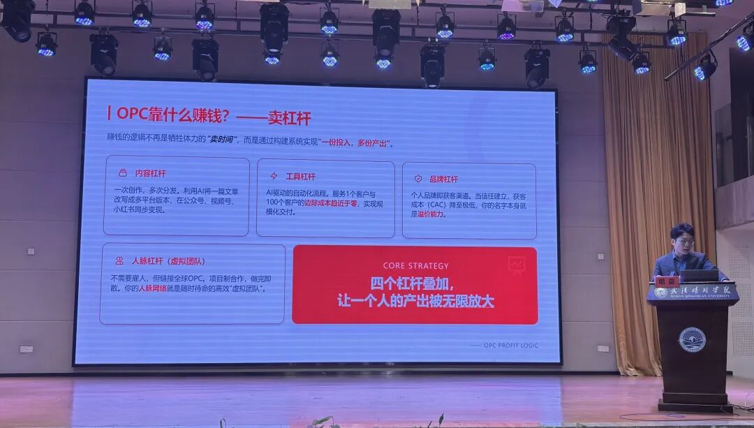 哈雷讲师还讲解了OPC核心工作要点与多元盈利模式,核心需做好公私财产隔离、明确AI内容版权、构建多元收入结构并融入行业生态;盈利可依托内容、工具、品牌、人脉四大杠杆,实现一份投入多份产出的高效变现。